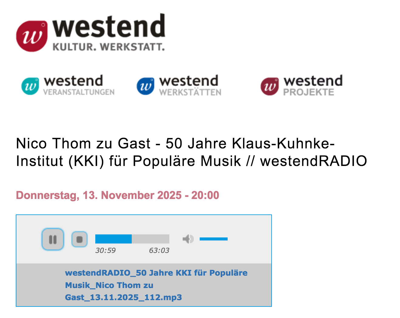 Nachhören kann man die Sendung hier: https://www.kultur-bremen.de/content/nico-thom-zu-gast-50-jahre-klaus-kuhnke-institut-kki-f%C3%BCr-popul%C3%A4re-musik-westendradio
