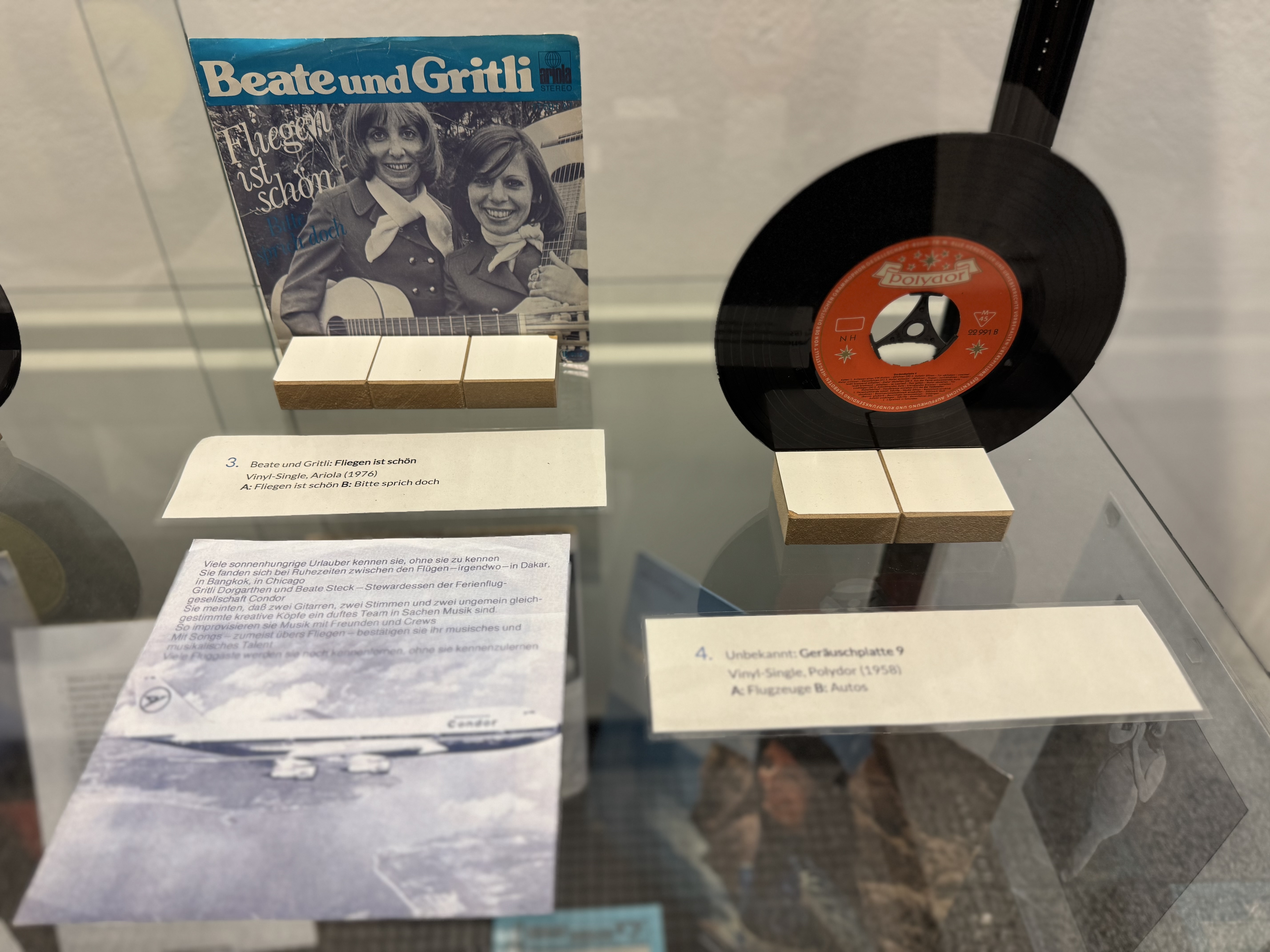 Schallplatten sind aus heutiger Sicht akustische Dokumente, die nicht nur die gesamtwirtschaftliche Situation ihrer Zeit reflektieren (Bosch; Getzmann; Quaas 2014: 150), sondern auch von inszenierten Träumen und indirekt von vermeintlich hinter sich gelassenen schweren Jahren erzählen. Mit Autogeräuschen auf der B- und dem Klang von Flugzeugen auf der A-Seite, handelt es sich bei dieser Single um eine Geräuschplatte, wie sie üblicherweise für Effekte in Hörspielen oder Filmen verwendet worden. Sie eröffnet eine andere Dimension der Flugreise.