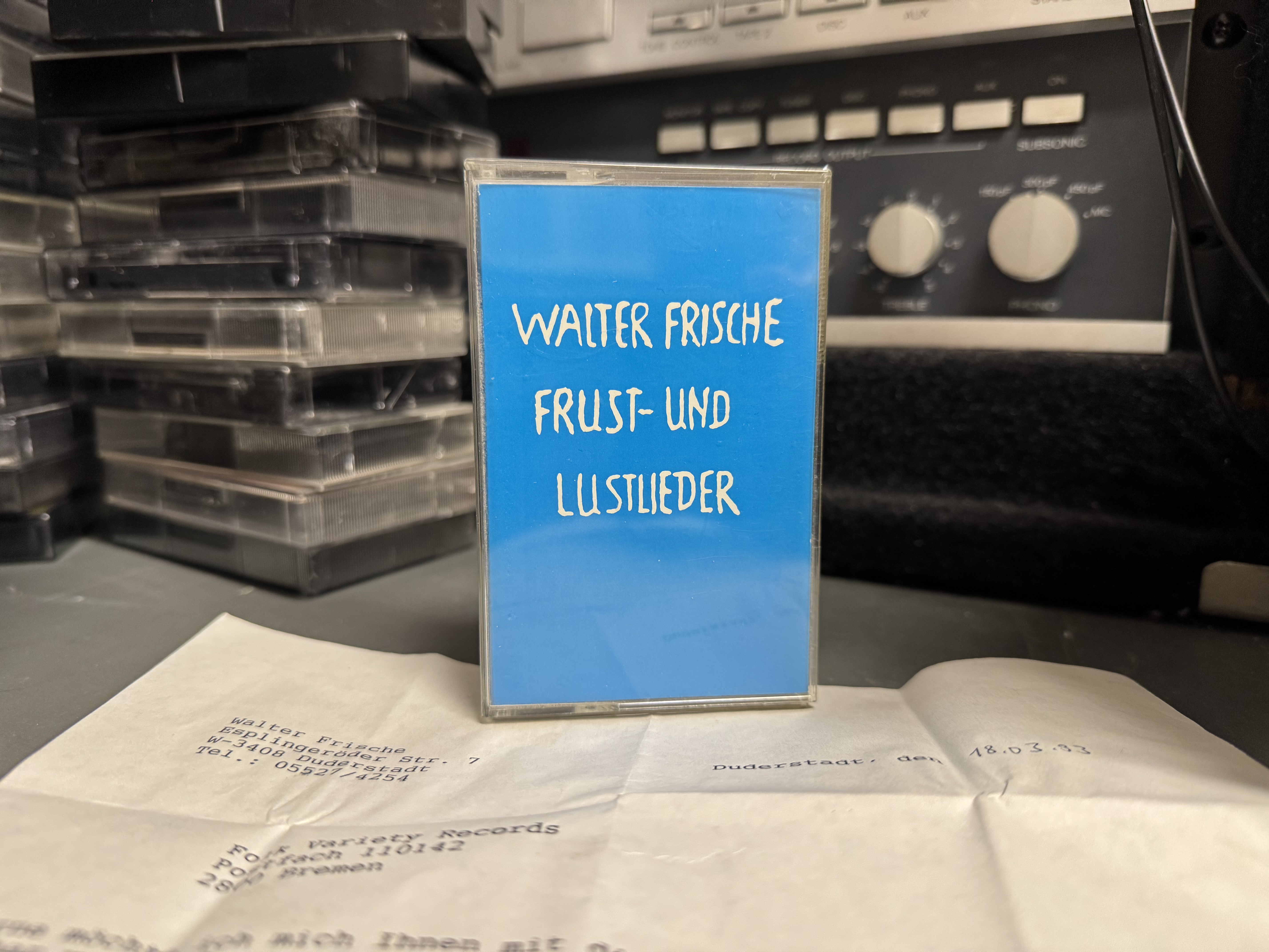 Die Musikgeschichte kennt viele Gewinner, aber noch wesentlich mehr Verlierer bzw. Künstler:innen, die es nicht geschafft haben, genug Aufmerksamkeit zu erzeugen und in den Kanon einzugehen. Einer von ihnen ist sicherlich Walter Frische. Der Liedermacher aus Duderstadt hat Anfang der 1990er Jahre dazu Anlauf genommen, seine Musik auf Tonträgern zu verbreiten. Als Medium dafür wählte er die Kompaktkassette, die zu diesem Zeitpunkt bereits an Bedeutung eingebüßt hatte und von der CD abgelöst wurde.